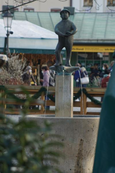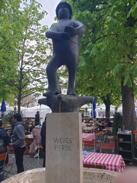Brunnen ist dem Volkssänger Weiß Ferdl gewidmet. Eigentlich hieß er ja Ferdinand Weißheitinger, als er am 28.06.1883 in Altötting geboren wurde. Als Kind war er Sängerknabe in Altötting und Salzburg. Er absolvierte eine Lehre als Buchdrucker, bevor er zum ersten Mal in Regensburg als Komiker auftrat. Dann schob er seine Himmelfahrtsnase auch in das Münchner Volkssängergeschehen und wurde mit 23 Jahren am dortigen Platzl engagiert. Dort wirkte er dann über drei Jahrzehnte lang und wurde mit 38 neben Sepp Eringer zum Platzl - Direktor. Er spielte auch in vielen Heimatfilmen mit, und zahlreiche Tondokumente zeugen von seinem reichen Schaffen. Dazu verfasste er etliche Bauernstücke und Bücher. Sein Humor war immer geradeheraus, seine Kunst war die der Andeutungen. Jeder verstand, ohne dass etwas gesagt worden wäre. Anekdote: Weiß Ferdl trieb während der Nazizeit einmal drei Schweine auf die Bühne. Er kommentierte: "Die kleine da ist das Kind Mann, die mittlere ist die Frau Mann, und wegen dieser fetten Sau hab ich 8 Tage sitzen müssen". Jedermann wusste, was gemeint war ... Am 19.06.1949 starb er im Alter von 66 Jahren in München, ein Jahr nach Valentin. Begraben liegt er auf dem Sollner Waldfriedhof. Bereits vier Jahre später, 1953, errichtete man, im gleichen Jahr wie dem Valentin, auch dem Weiß Ferdl, dem beliebten Volkssänger und Humoristen, am Viktualienmarkt im Stadtbezirk 01 - Altstadt - Lehel ein Brunnendenkmal. Er ist, im Dachauer Bauerngwand, von dem Bildhauer Josef Erber gestaltet. Den Guß besorgte Hans Mayr aus München. Der Brunnenpfeiler ist aus Marchinger Kalkstein. Die Enthüllung des Brunnens fand zusammen mit der des Valentinbrunnens am 18.10.1953 statt, was ausgerechnet ein Kirchweihsonntag war. Die Aufschrift "Münchner Bürger ihrem Volkssänger" schmeichelt dem Weiß Ferdl sichtlich. Klein und gedrungen steht er auf dem Sockel. Spitzbübisch reckt sich unter dem flachrunden Hütchen seine Himmelfahrtsnase aus dem runden Kopf zum Alten Peter hoch, und über seine geschürzten Lippen scheinen die Töne seiner Lieder "Ein Wagen von der Linie 8..." oder das Lied "Vom Wunder der Münchner Weißwurst" in das Wasserbecken zu sprudeln. Etwas geniert, mit verlegen verschränkten Armen zeigt er sich seinen Bewunderern, die ihm frech in seine beiden Nasenlöcher gucken. Aufgedreht wurde der Brunnen damals von der Witwe, Bertl Weiß. Es handelt sich hier um einen - Trinkwasser führenden - städtischen Brunnen. |
