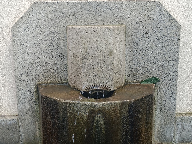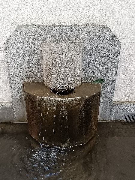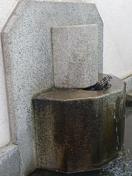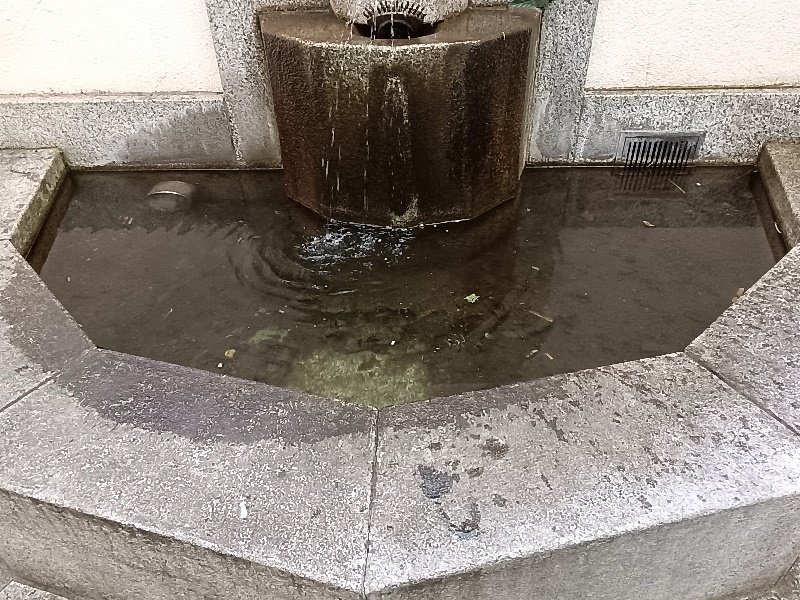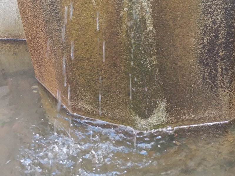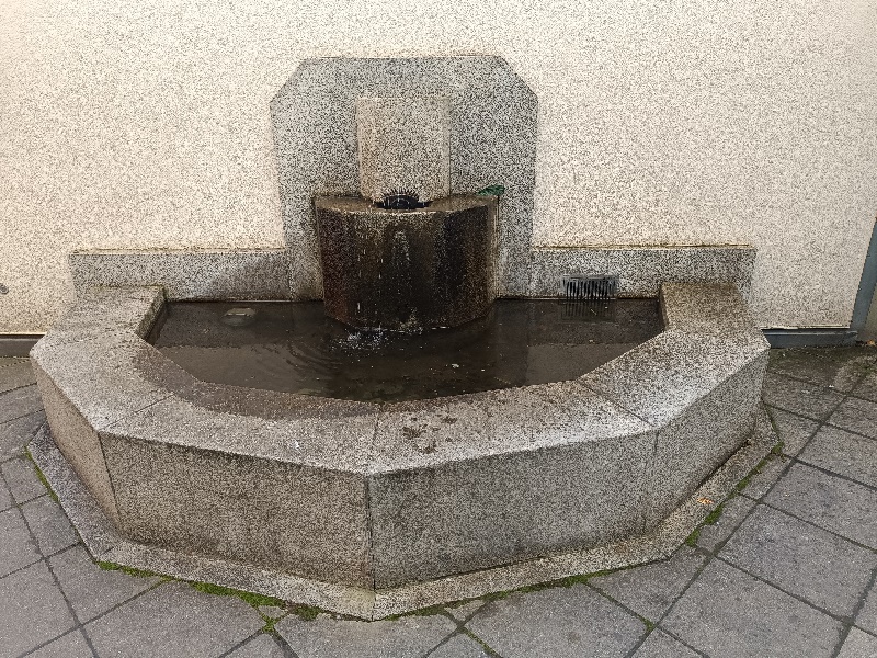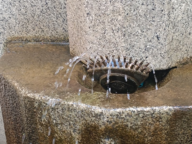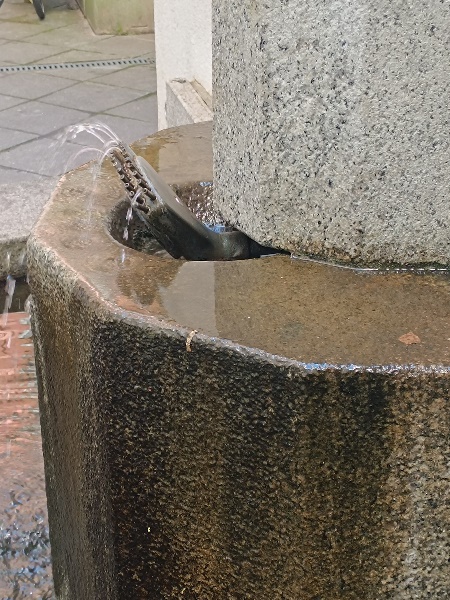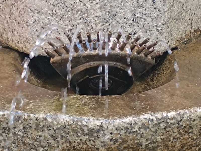 Brunnen. Sehr spärlich tritt das Wasser aus den Düsen aus, viele