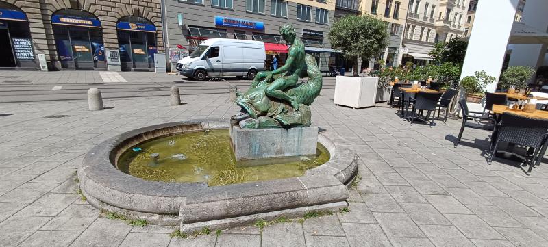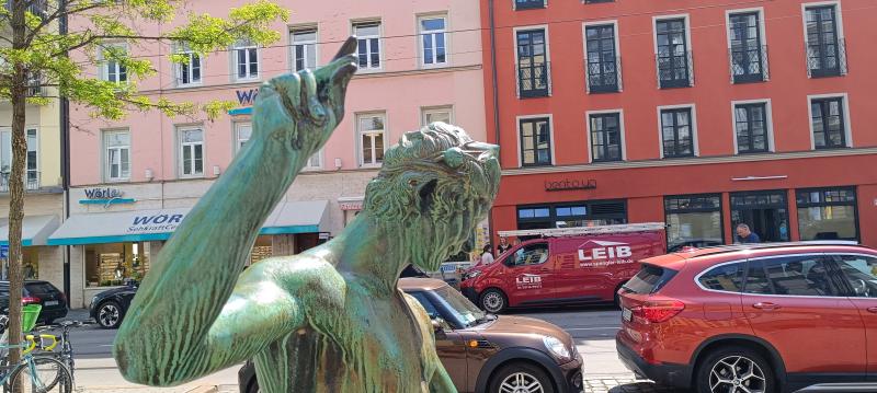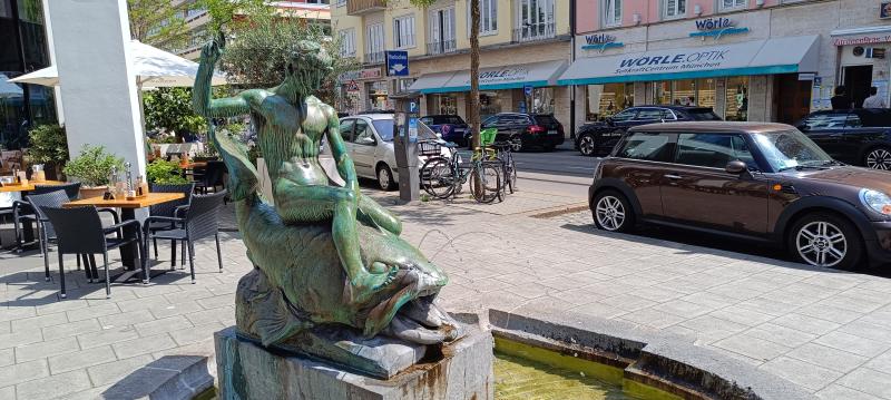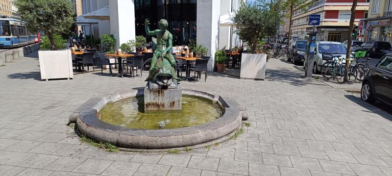 auf einem Delphin" Brunnen befindet sich an der Ecke Dachauer / Augustenstraße