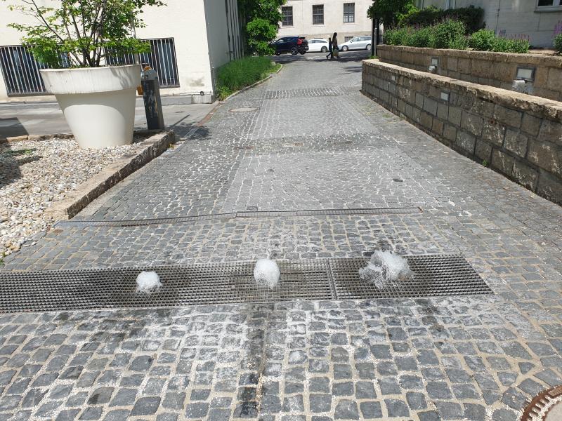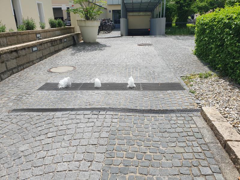 | Diese Brunnenanlage befindet sich an der Brienner Straße 45a im Stadtbezirk 03 - Maxvorstadt. Es handelt sich um drei Fontänen, die quer über eine Garageneinfahrt führen. Sehr skurril das ganze! Wenn jemand hinein oder hinausfahren möchte, wird durch Tor - und Schrankensteuerung die Fontäne kurzzeitig abgeschaltet bis das Fahrzeug die Stelle passiert hat. Mir wurde gesagt, dass die Pumpe nicht mehr die jüngste ist und die Fontänen früher bis zu 50 cm hoch waren. Dadurch, dass die Pumpe nicht mehr die volle Leistung bringt, halten sich die Fontänenhöhen in Grenzen. Dankeschön an dieser Stelle an den Haustechniker der Gebäude, der die Anlage extra für mich aktiviert hat! Hier handelt es sich um eine private Anlage. |