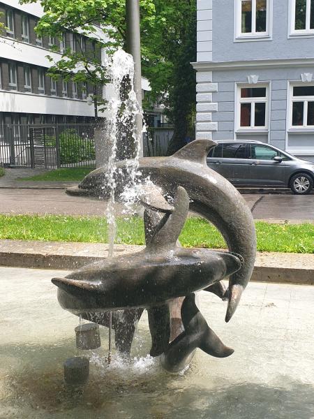 "Delphinbrunnen" befindet sich vor dem Gebäude des bayerischen