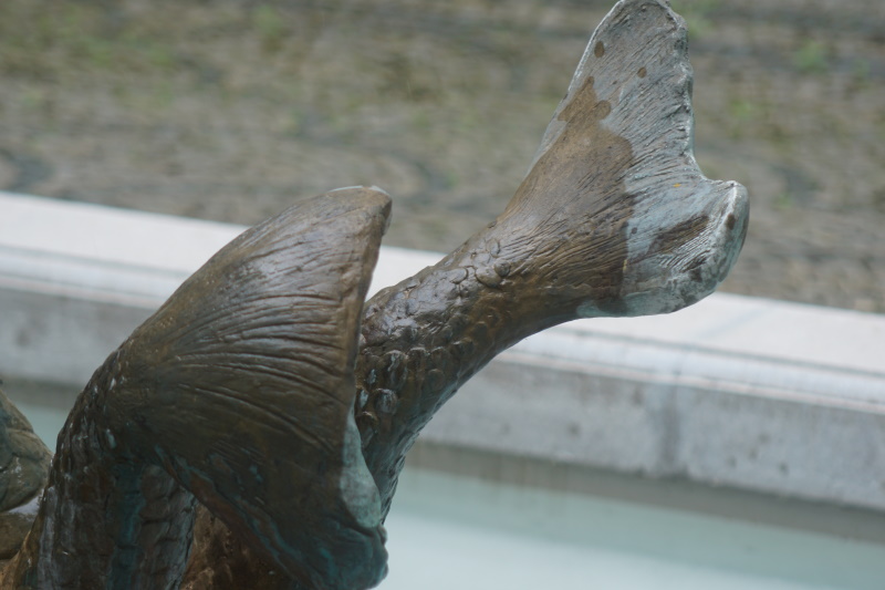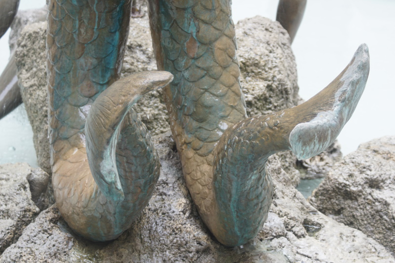 mit doppelt geschupptem Fischschwanz - scheint aus dem Wasser zu schnellen,