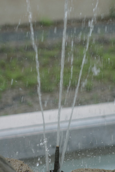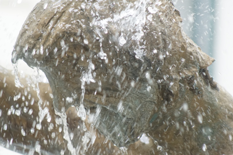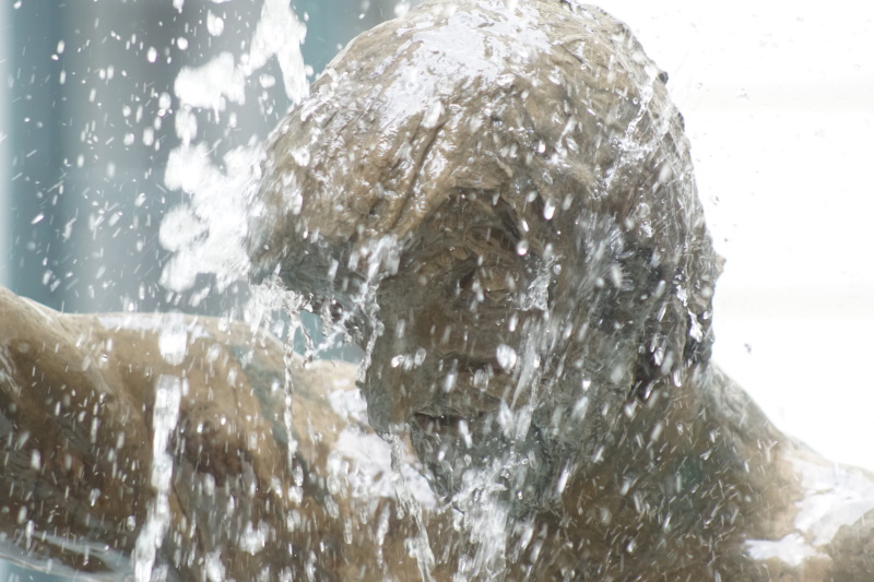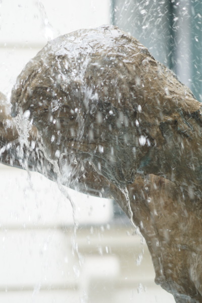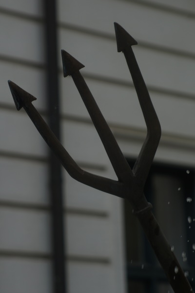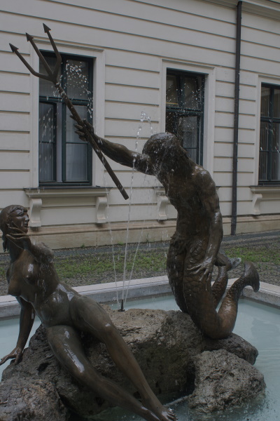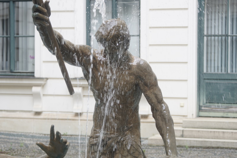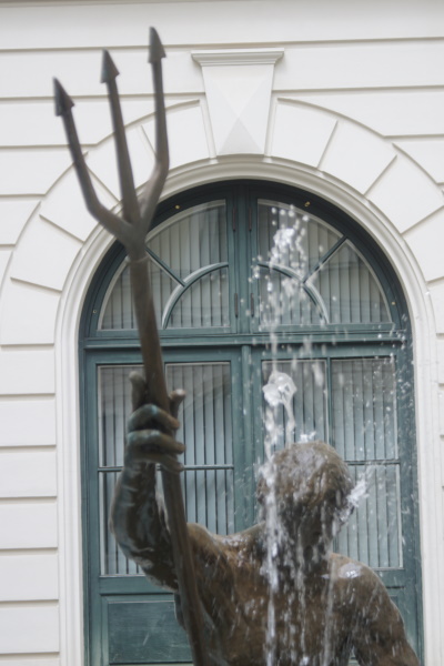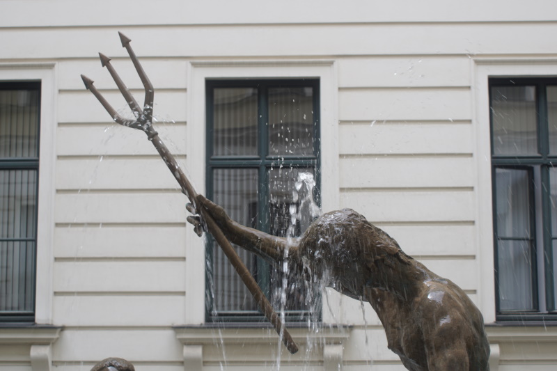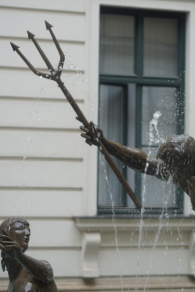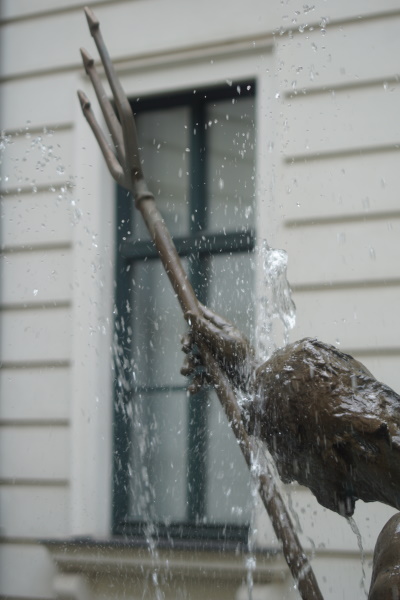 sodass eine Fontäne hochsprüht; mit einem Dreizack bewaffnet