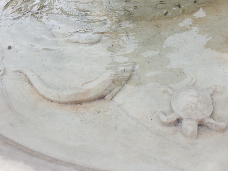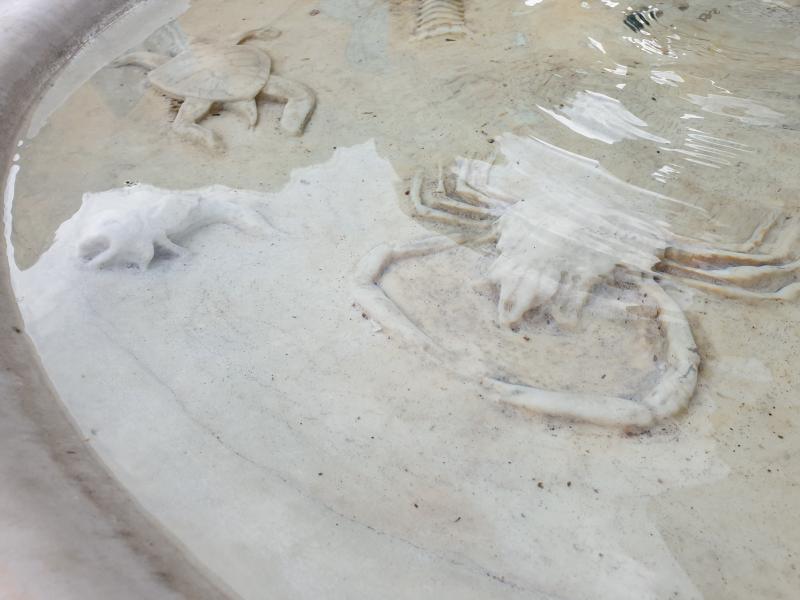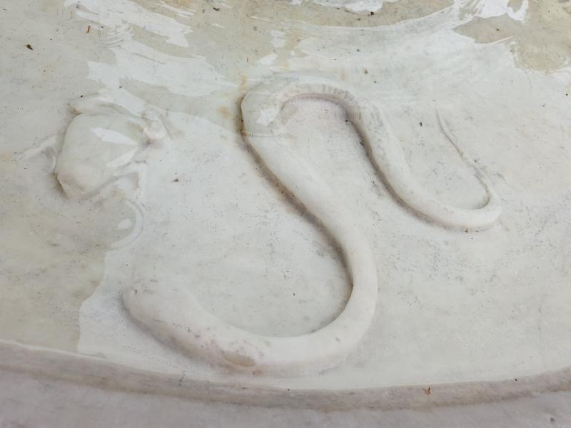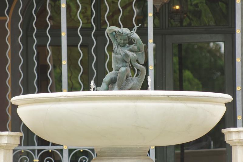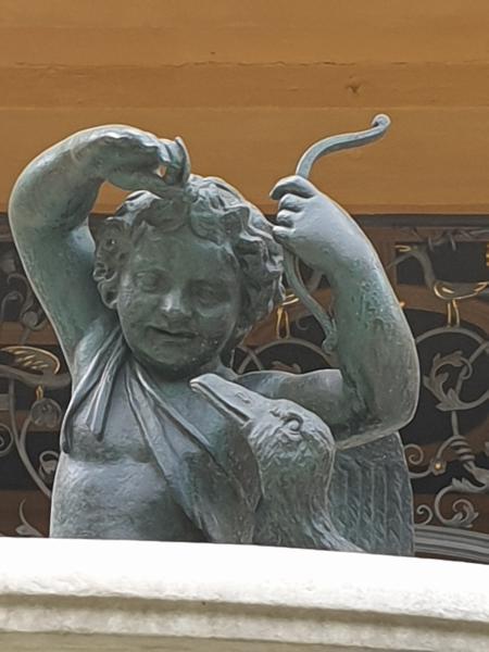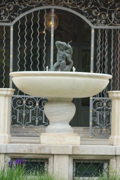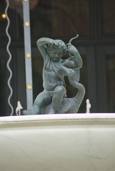 Liebesgott Eros auf einer steinernen Ente in rundem Becken sitzend dar.
