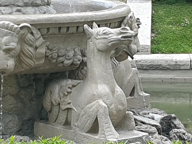 wiehernd vier Hippocampen, ebenso aus Marmor, der anlässlich der