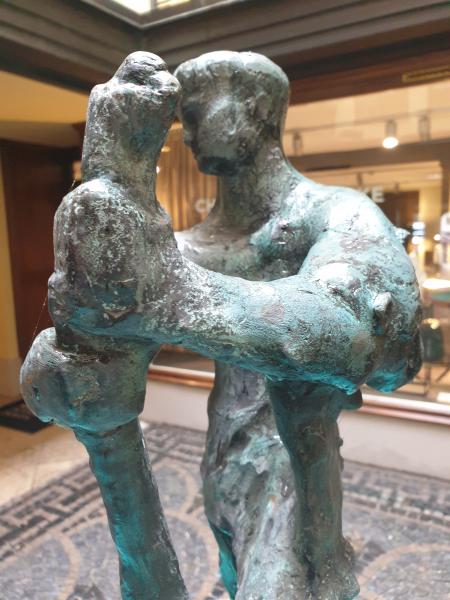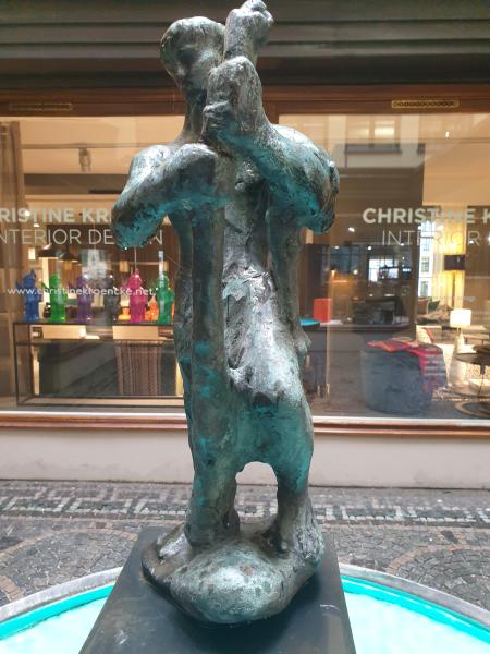 Bronzeschale. Darüber auf einem weiteren kleineren Sockel die Bronzeplastik,