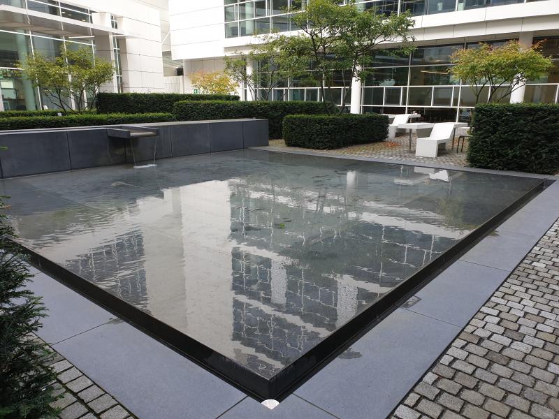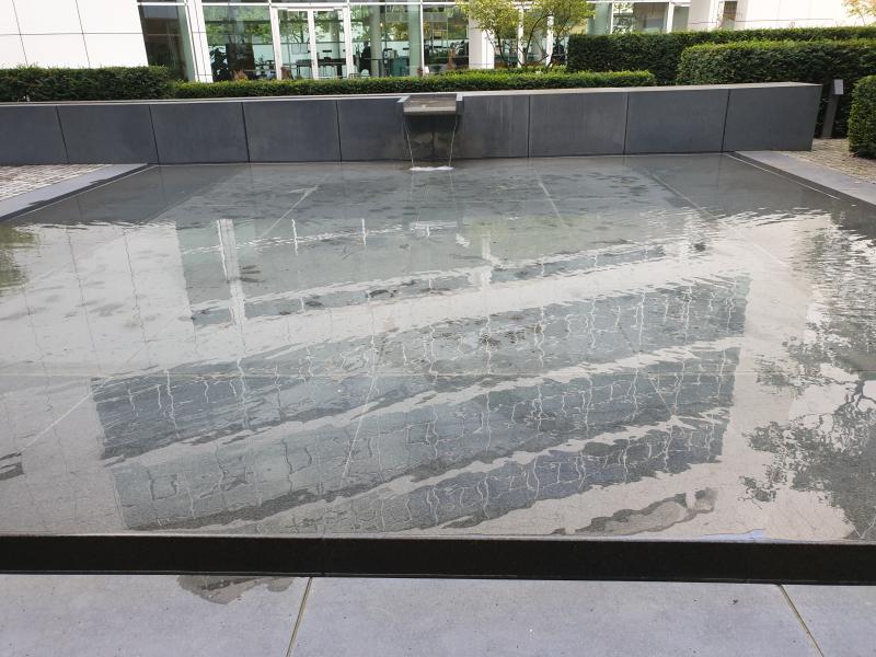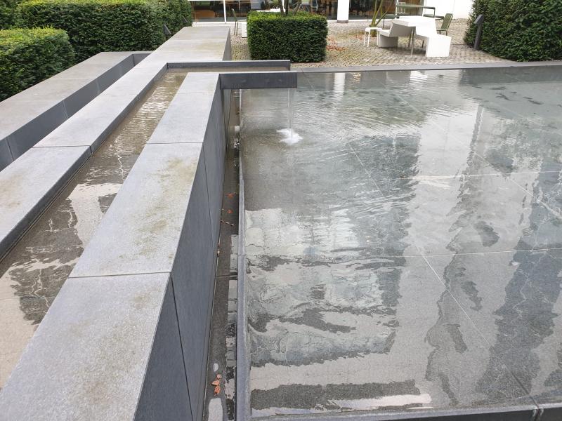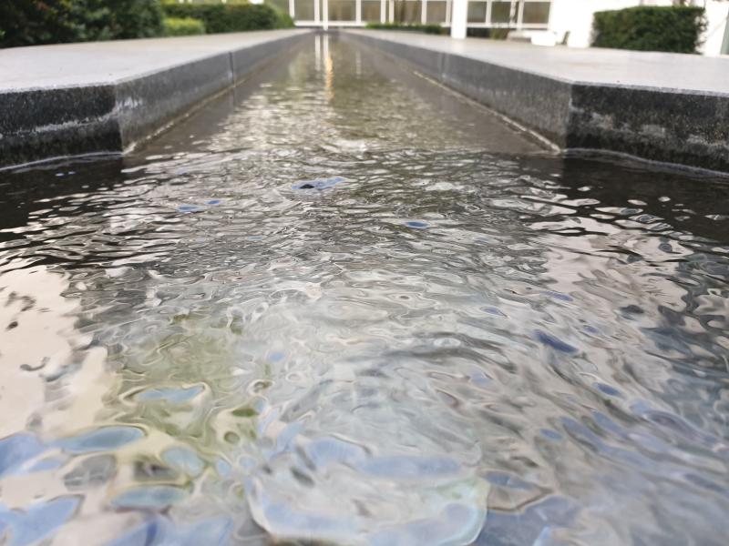 Leise und beruhigend plätschert das Wasser auf eine große Steinplatte,