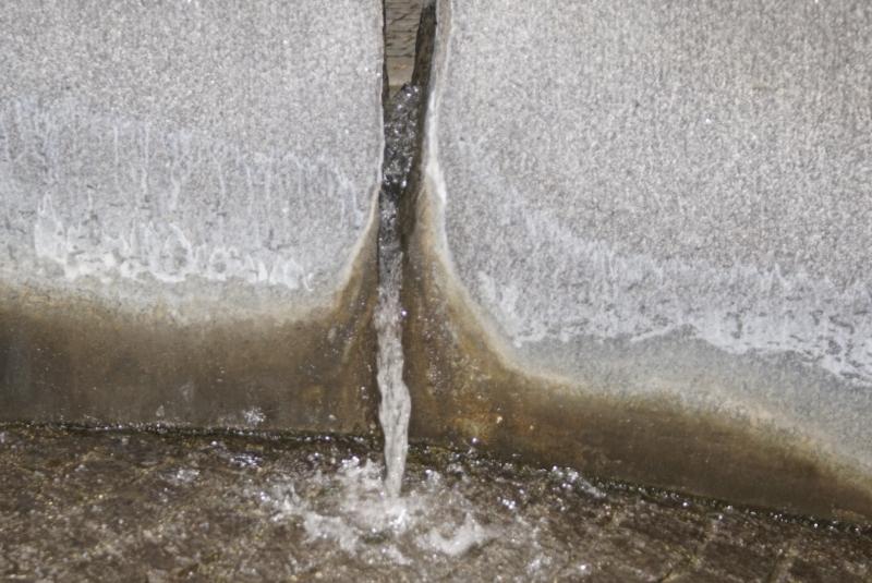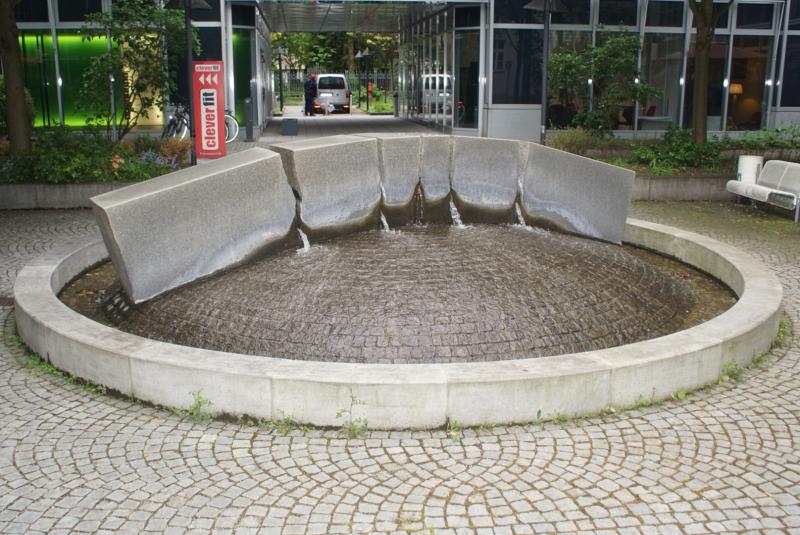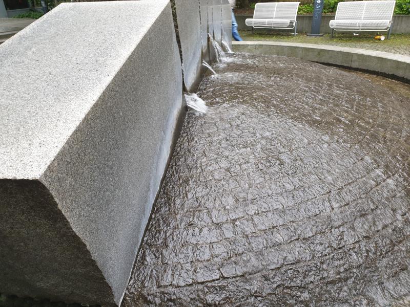 kleine Rundbrunnen mit Felsenwand, aus deren Fugen das Wasser in das Becken