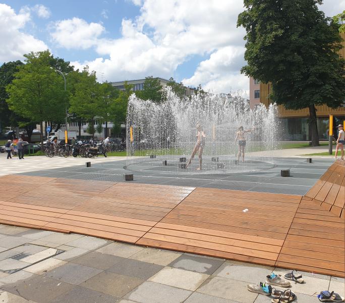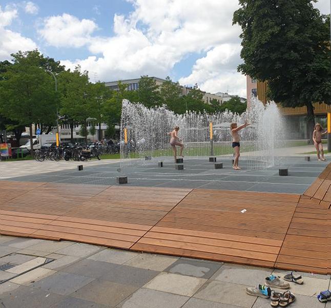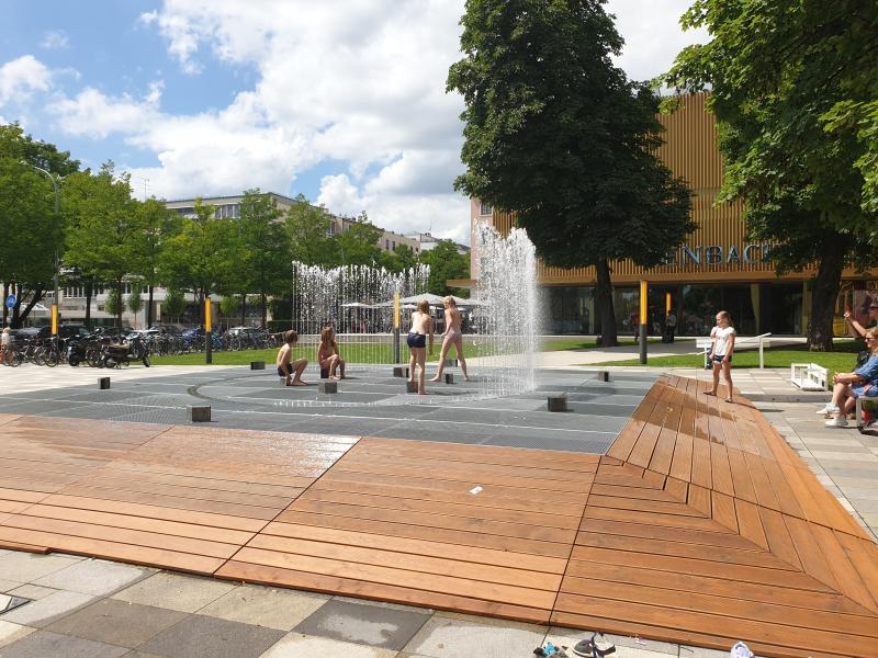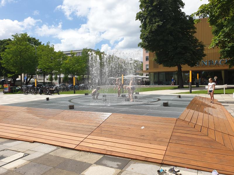 appelliert an die Spiellaune der Passanten und Passantinnen, den Brunnen