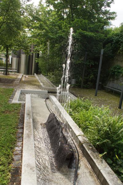 sich um eine modern konzipierte Brunnenanlage mit Auslaufbecken. Sie besteht