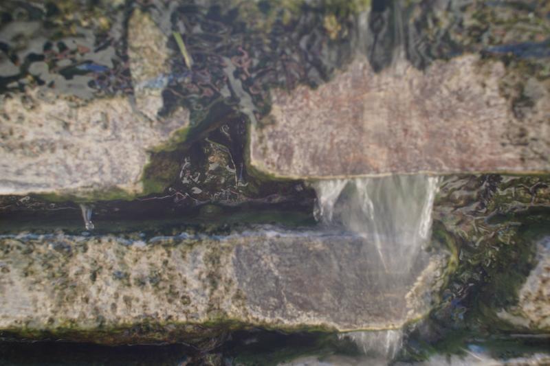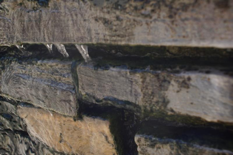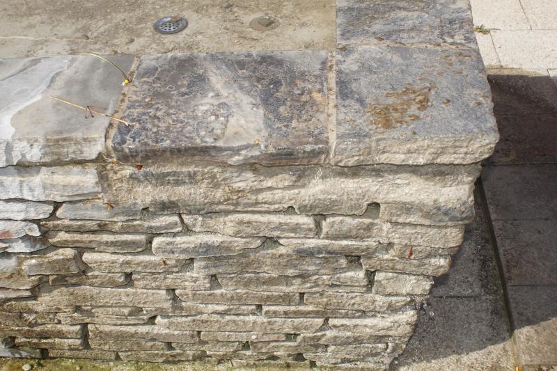 eine Rinne eingearbeitet ist, in der das Wasser am Ende der Mauern hinunterfließt.