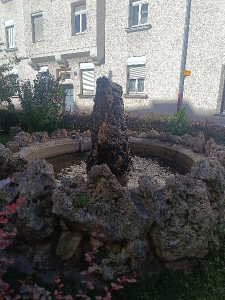 Brunnen befindet sich auf einer kleinen Grünfläche in der Hochmeierstraße