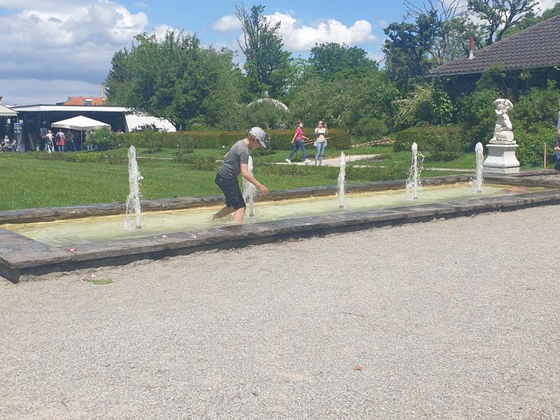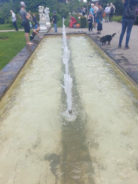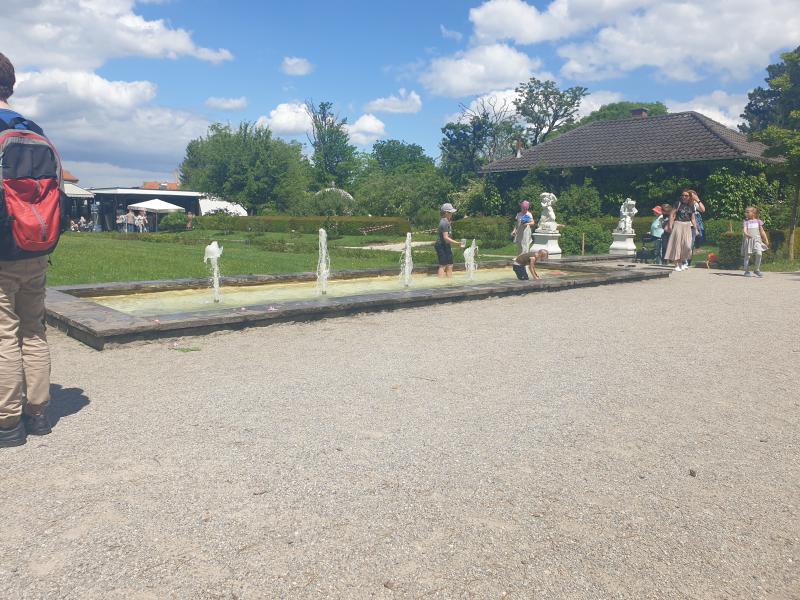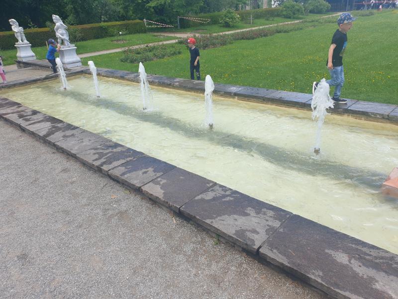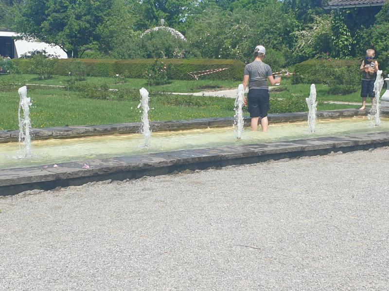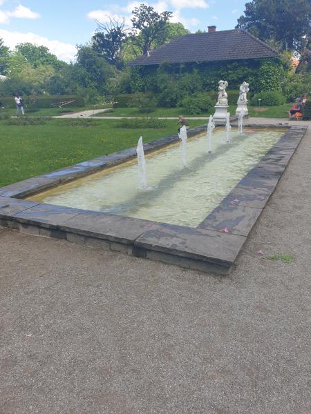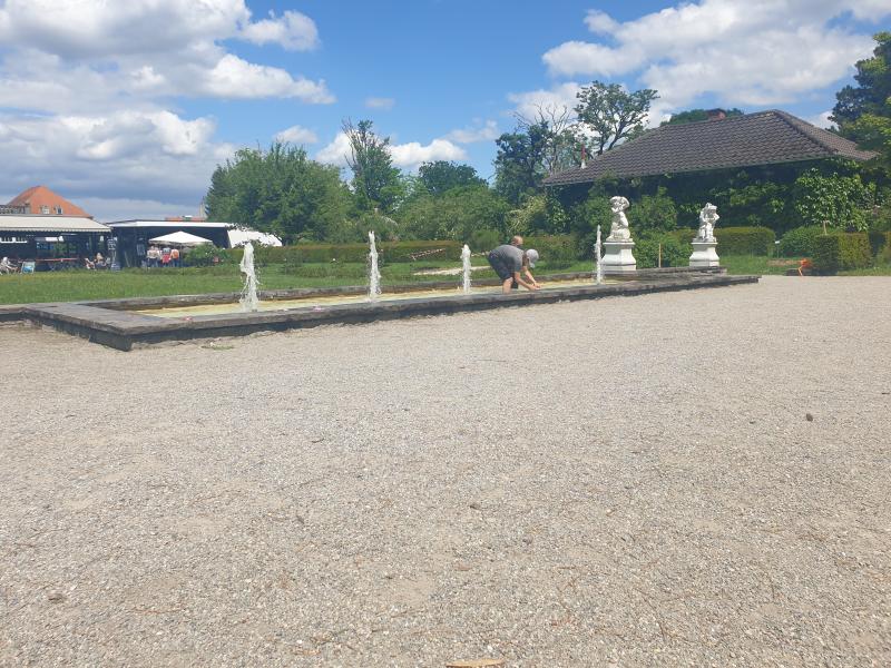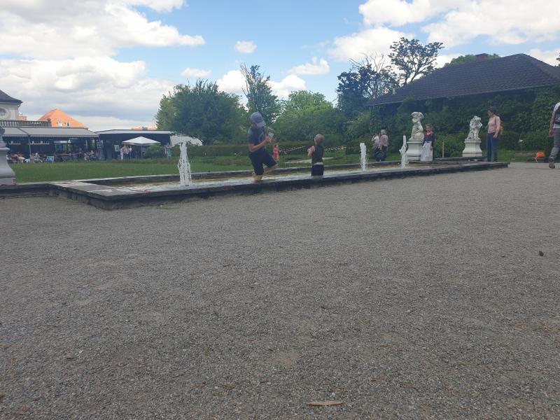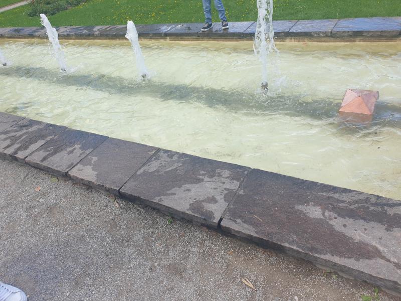 interessante Flächenbrunnen mit fünf Fontänen befindet