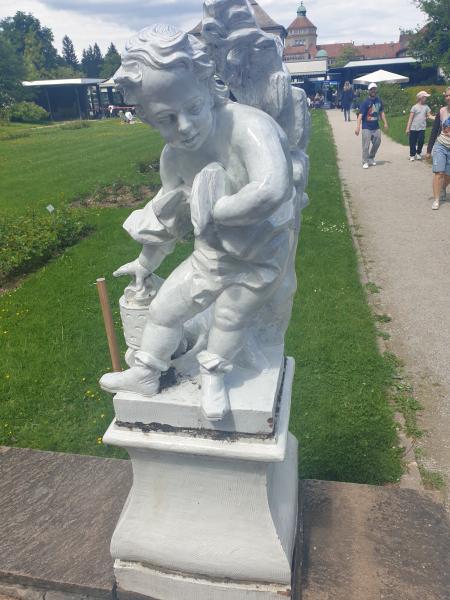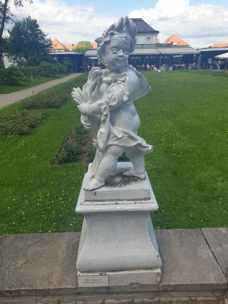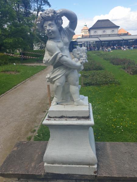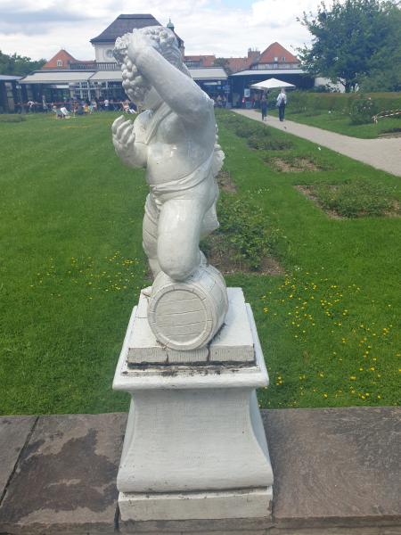 Er ist von allegorischen Figuren umgeben und ist hinter dem Cafe zu finden.