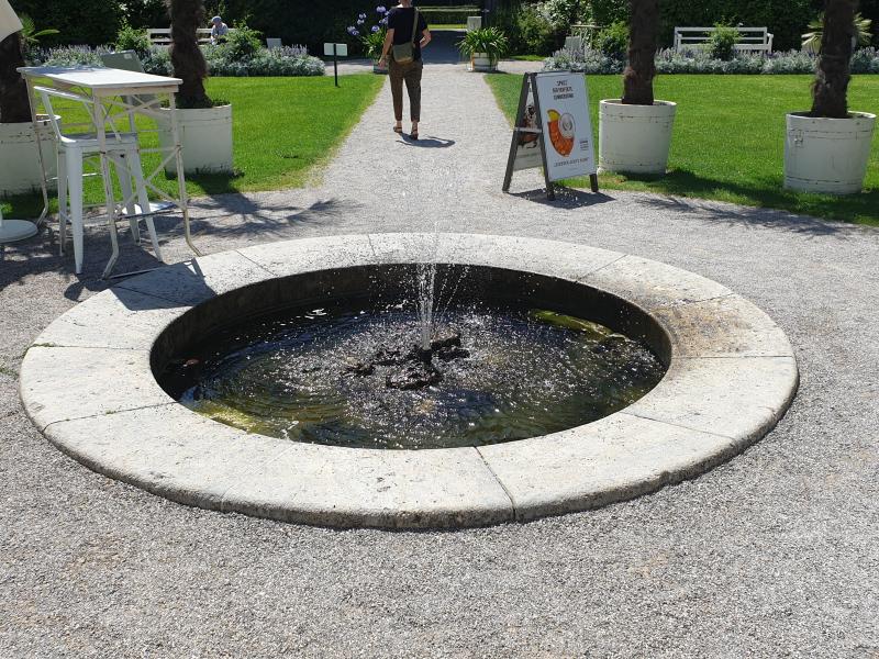 Brunnenanlage befindet sich vor dem Cafe zum Palmengarten im Park des