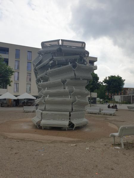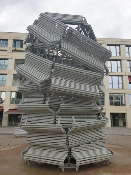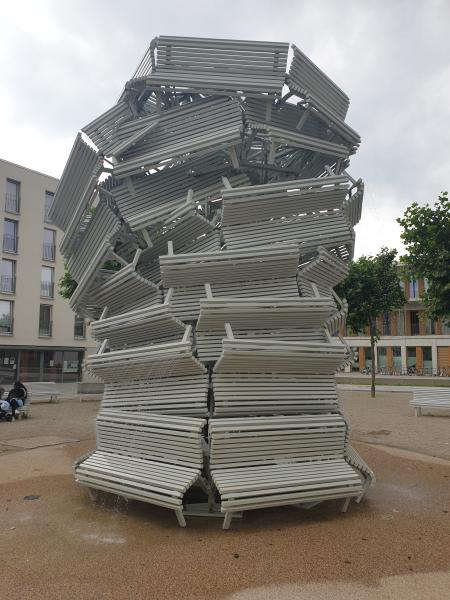 Durch die Stapelung von Sitzbänken erwächst im mittleren Bereich eine zirka sieben Meter hohe, turmartige Brunnenskulptur. Vom oberen Bereich der Skulptur fließt aus zahlreichen Banklatten Wasser nach unten in das bodenbündige Brunnenbecken. Einzelne Latten der Sitzbänke und der zur Brunnenskulptur gestapelten Bänke dienen als Leuchtkörper und erzeugen eine besondere nächtliche Atmosphäre. Meiner Meinung nach ein skurriler, aber kein schöner Brunnen. Hier handelt es sich um einen städtischen Brunnen. |