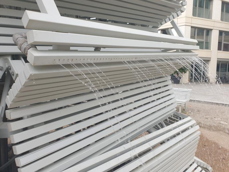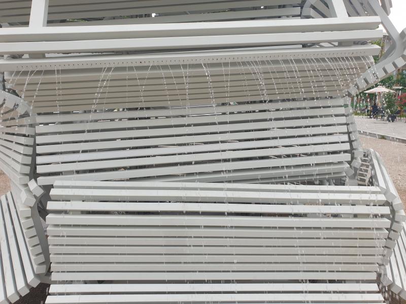 Wasser aus den oberen Banklatten in ein ebenes Becken am Boden. Einzelne