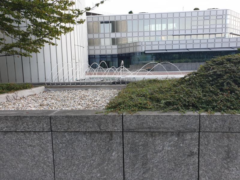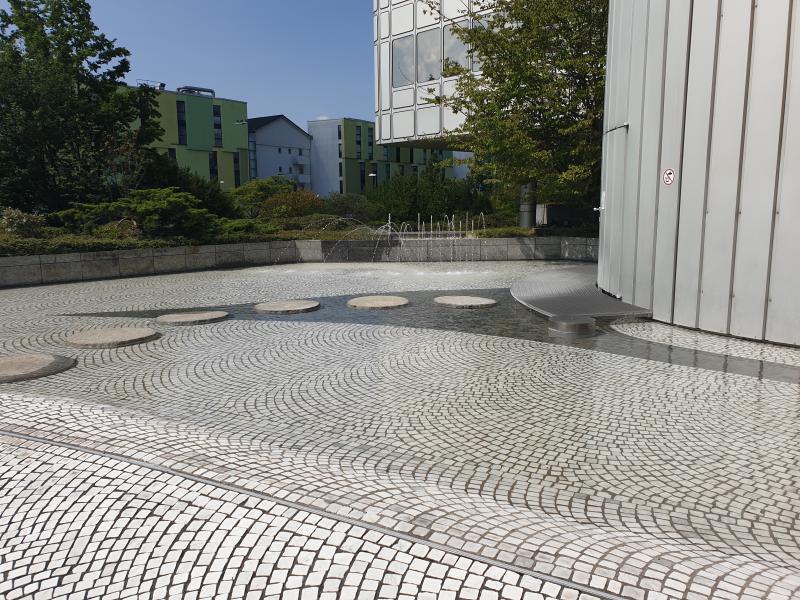 eine von drei Brunnenanlagen, die sich vor einem Hochhaus an der Arabellastraße