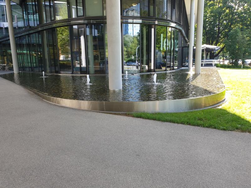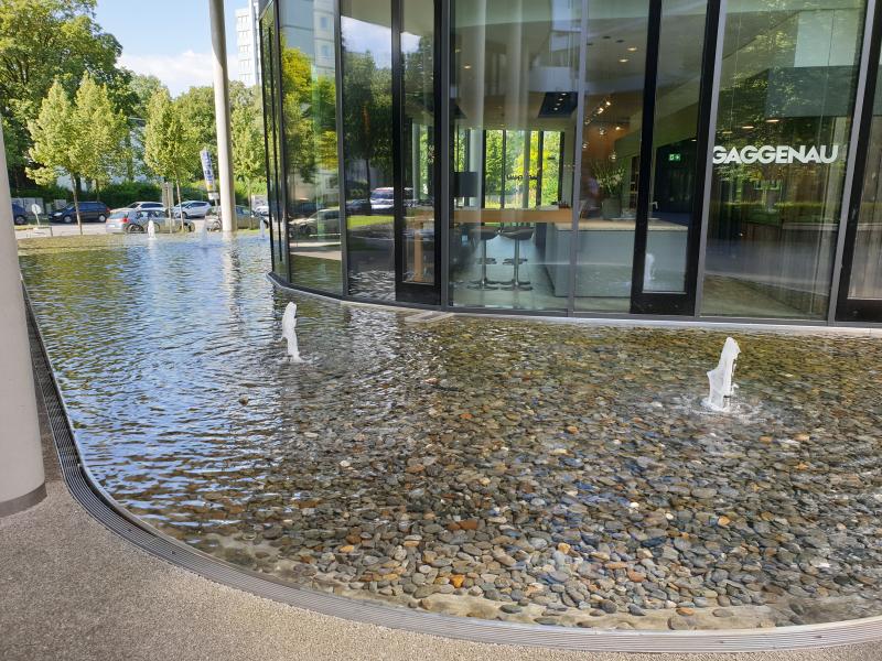 das Wasser aus kleinen Fontänen in mit Kies gefüllte Becken.
