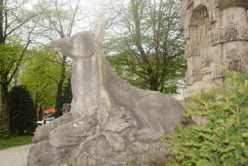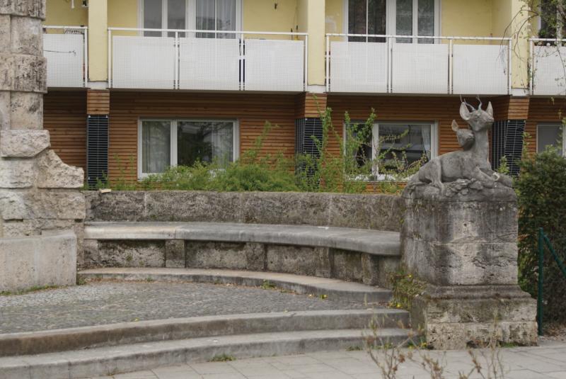 einer halbkreisförmigen Bank eingerahmt wird, an deren Enden Rehgruppen