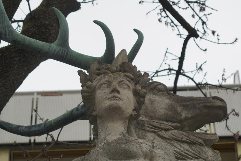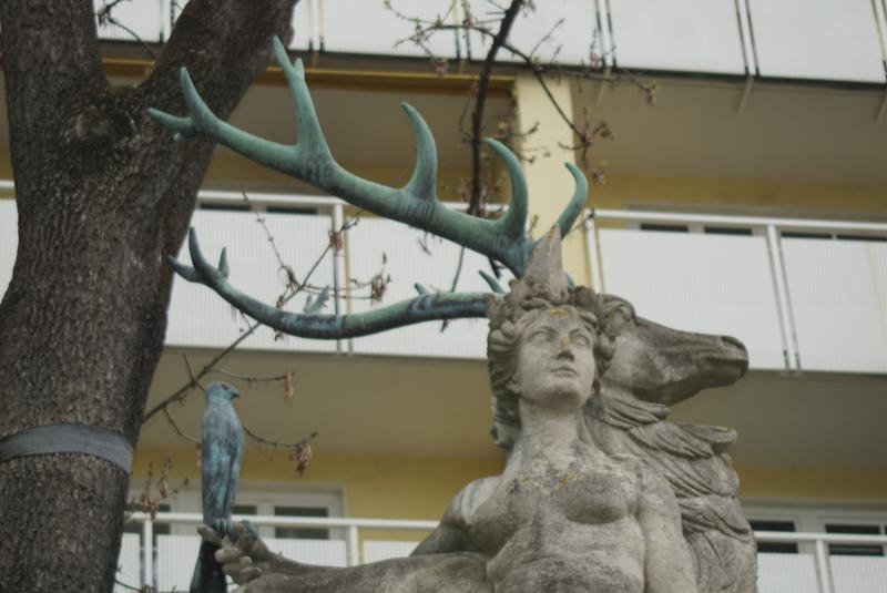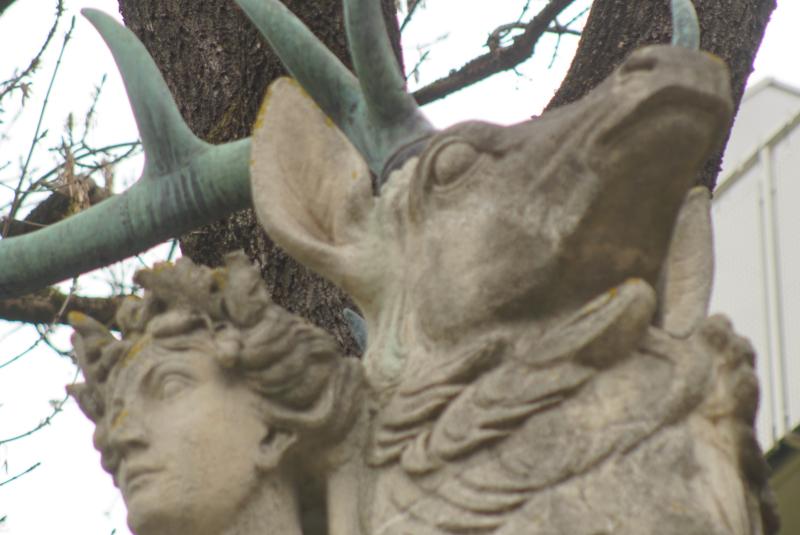 Über dem Brunnenbecken bildet ein Hirsch mit einer Dianafigur den