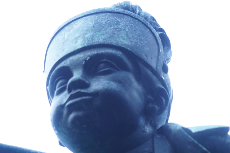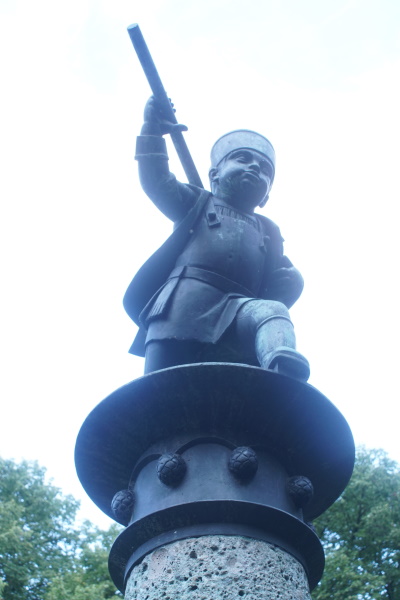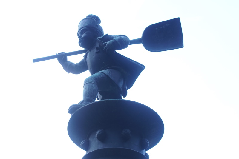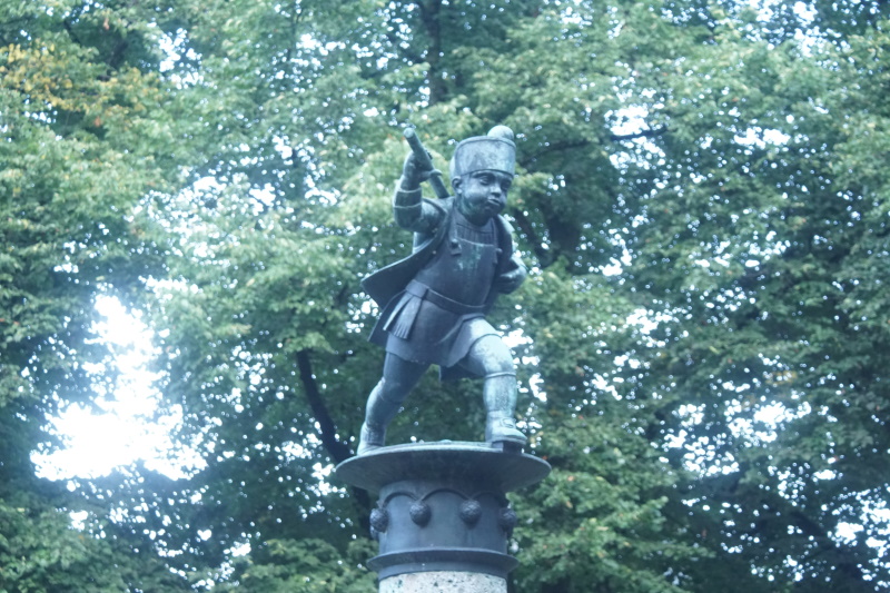 vier Wasserzuläufe, sie trägt die Bronzefigur eines Mälzerbuben.