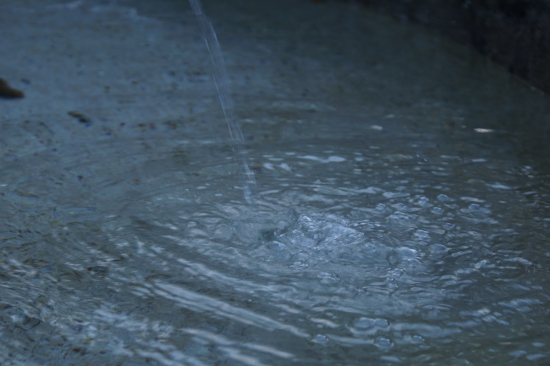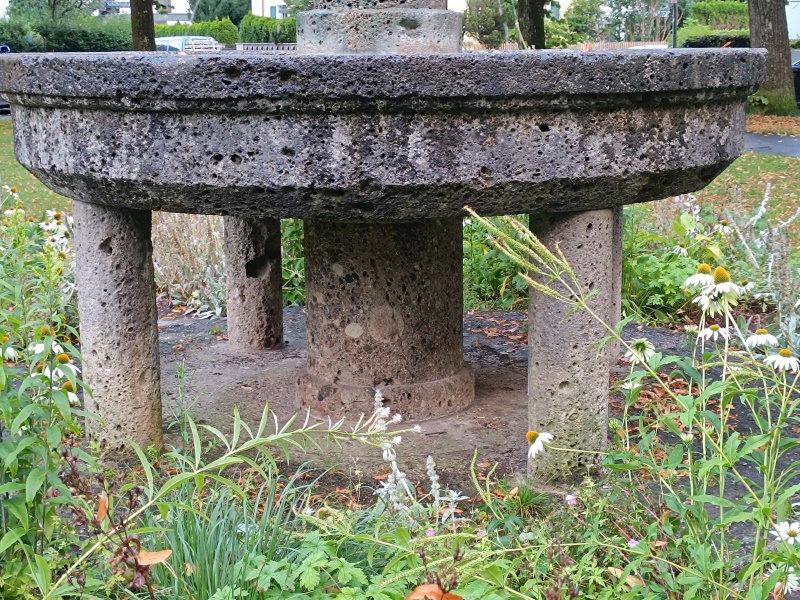 Ein Steinbecken steht auf vier Säulen. Eine fünfte, dickere