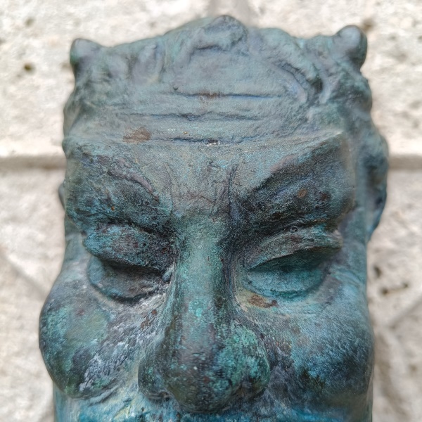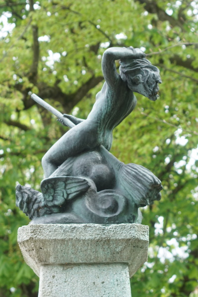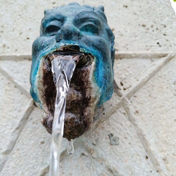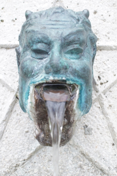 Säule ziert ein gehörnter Faunenkopf mit Wasserauslass auf einem
