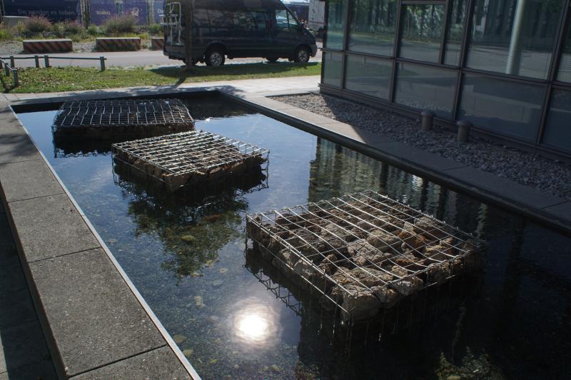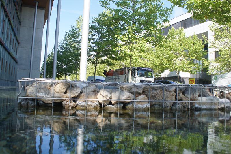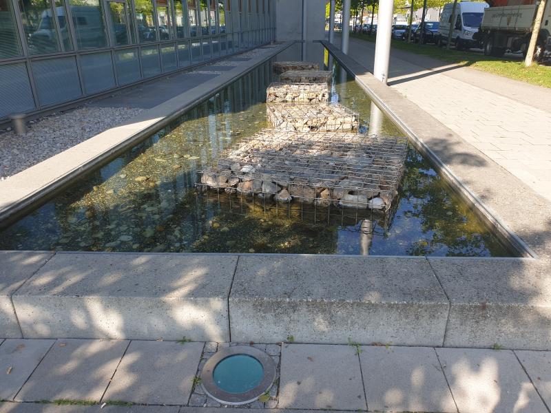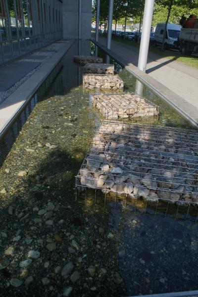 fünf Gitterkonstruktionen mit Steinen im Becken verbaut. Man sieht