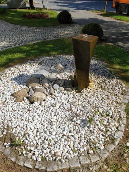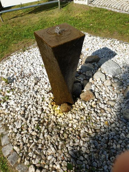 kleine, zierliche Springbrunnen befindet sich vor einem Geschäftshaus