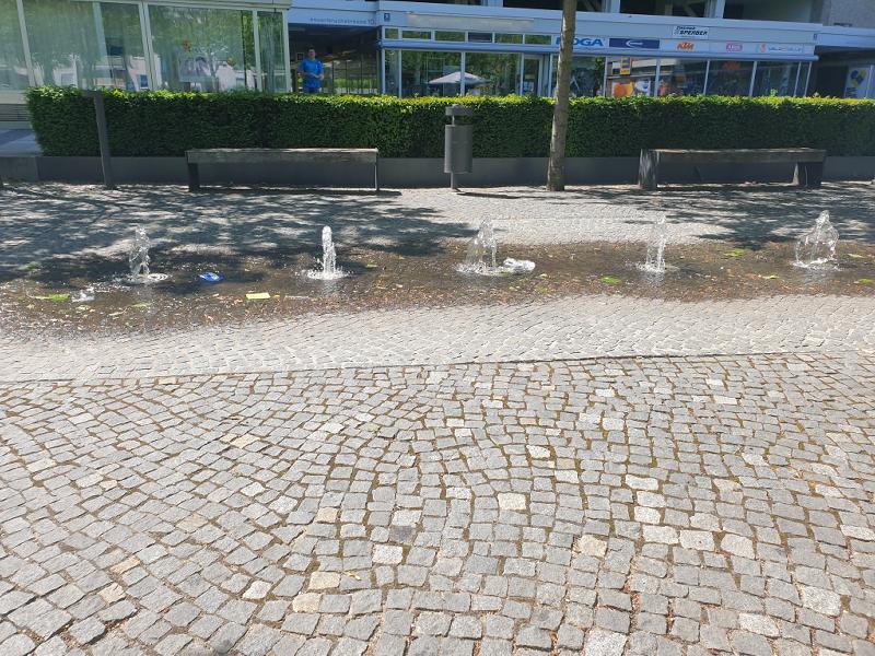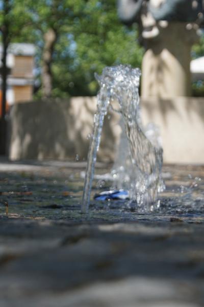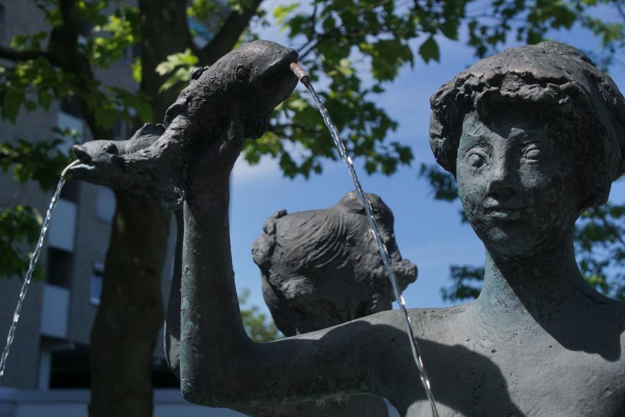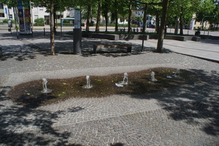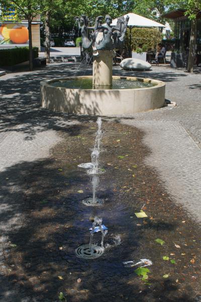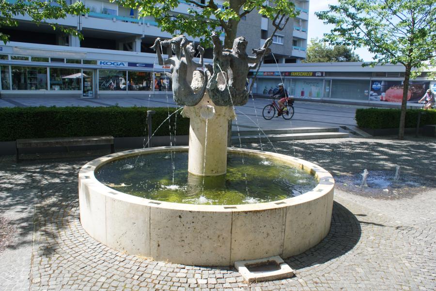 einem kleinen Platz im Stadtbezirk 20 - Hadern und wurde 1967 von Elmar Dietz gestaltet. Einweihung des Brunnens war am 27.06.1967. Die Steinmetzarbeiten wurden von Karl Hilbinger aus München ausgeführt. Das Becken und die Säule bestehen aus Marchinger Kalkstein, die Bronze - Rundplastik mit Signum "Elmar Dietz" goss die Kunstgießerei Otto Strehle aus Neuötting. Früher sah es hier etwas anders aus, die kleinen Bodenfontänen waren damals noch nicht vorhanden und die Bänke um den Brunnen herum hatten noch Lehnen. |