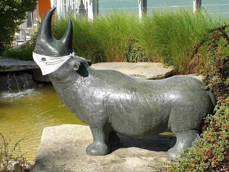 muss sogar das bronzene Nashorn einen Mundschutz tragen :-) Um den Brunnen