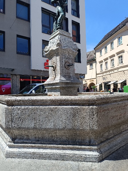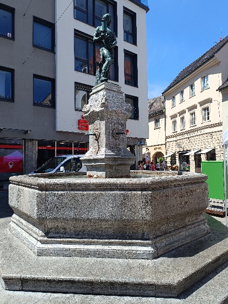 Pokal in seiner rechten Hand hält. Das Wasser des Goldschmiedebrunnens