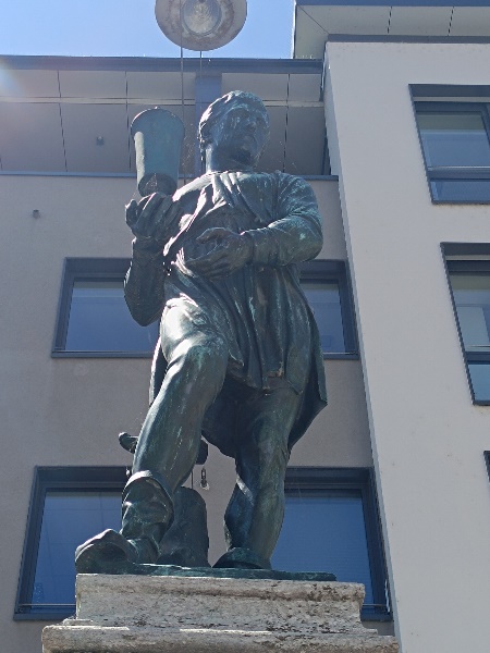 Pfeiler steht ein lebensgroßer Goldschmiedemeister, der einen vergoldeten