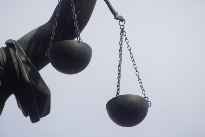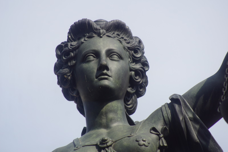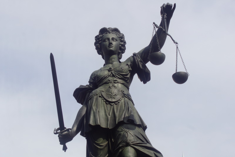 die Göttin der Gerechtigkeit mit Richtschwert und Waage, blickt mit