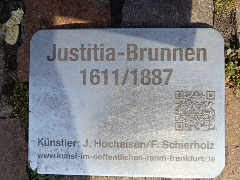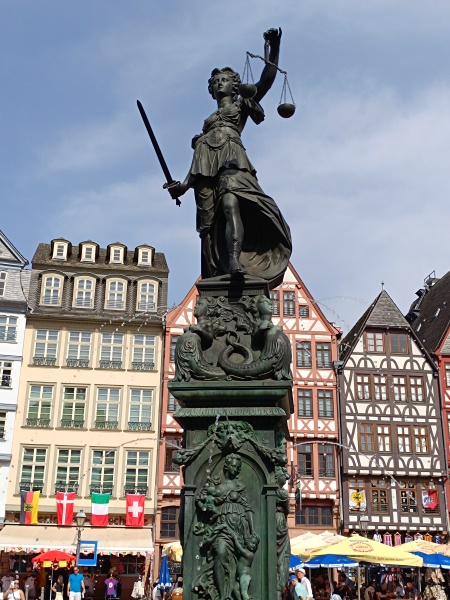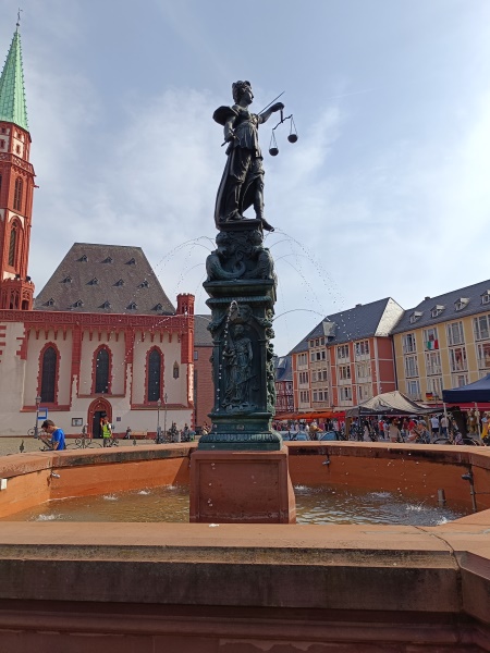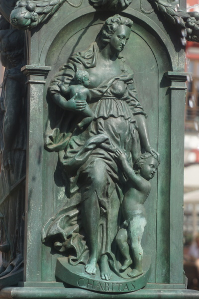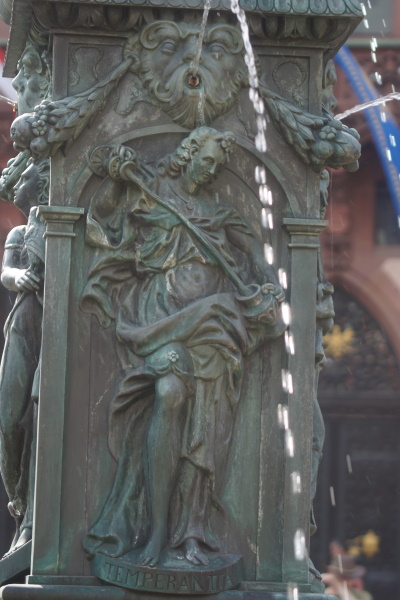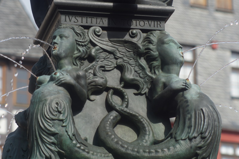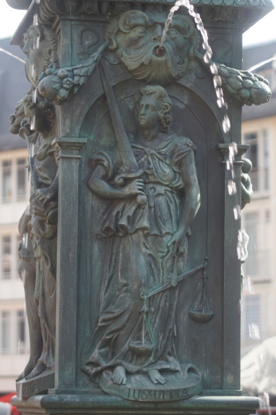 unverbundenen Augen auf die Römerberg - Nordseite, Temperantia, die Mäßigung, beim Verteilen einer Flüssigkeit zwischen zwei Krügen, mit Blick in Richtung des Samstagsberges respektive der Römerberg - Ostzeile, Spes, die Hoffnung, mit einer Taube auf dem Arm, gegenüber der Alten Nikolaikirche, sowie Charitas, die Liebe, mit zwei Kindern, von denen sie eines stillt, zum Römer hin. Über den Köpfen der Tugenden befinden sich wasserspeiende Masken, zwischen letzteren über die Ecken gespannte Festons. Nach einem erneuten Wulst mit Eierstabdekor bilden jeweils zu den Ecken gewandete Sirenen die vorletzte Stufe des Aufbaus. Die Brüste, die sie sich mit den Händen halten, sowie der Mund dienen als Wasserspeier. Oberhalb der Darstellung verläuft um die Kanten ein glattes Band mit der Inschrift "Iustitia in toto virtutum maxima mundo sponte sua tribuit cuilibet aequa suum". Die deutsche Übersetzung ins Versmaß gesetzt lautet: „Justitia, auf der Welt der Tugenden erste und größte, teilt mit gerechter Hand jedem das Seinige zu.“ Die Inschrift bezieht sich bereits auf die darüber befindliche, den Aufbau abschließende Brunnenfigur. Diese ist die Göttin Justitia mit den Attributen des Richtschwerts und der Waage. Im Gegensatz zu den meisten anderen Darstellungen sind ihr aber nicht die Augen verbunden. Zur Ikonografie des Brunnens existieren keinerlei Aufzeichnungen aus der Entstehungszeit oder auch moderne Untersuchungen. Bezüglich der Verkörperungen der Tugenden ergibt sich alleine aus ihren sichtbaren Attributen, dass es sich um eine Auswahl von jeweils zwei Kardinal- und theologischen Tugenden handelt. Wären die vier Kardinaltugenden, also Klugheit oder Weisheit, Gerechtigkeit, Tapferkeit und Mäßigung dargestellt, so ließen sich die Darstellungen der Hoffnung sowie der Charitas nicht ikonografisch sinnvoll der verbleibenden Klugheit oder Weisheit respektive der Tapferkeit zuordnen. Dem klassischen Darstellungsmuster theologischer Tugenden folgt dagegen die Hoffnung als Frau mit Taube – entgegen der klassischen mythologischen Spes, wo sie meist mit einer Krähe zu sehen ist – sowie vor allem die Liebe als Charitas mit Kindern. Aufgrund des Mangels an Literatur nicht nachweislich erklärbar sind dagegen etwaige Absichten hinter der Auswahl der Tugenden aus den genannten zwei Gruppen sowie die Tatsache, dass die bekrönende Figur seit jeher ihren Blick auf das Rathaus der Stadt gerichtet hat. Letzteres war nicht nur Sitz des Stadtrats, sondern auch des Schöffen- und Strafgerichts, dessen Funktion im Mittelalter von den Ratsherren wahrgenommen wurde. |