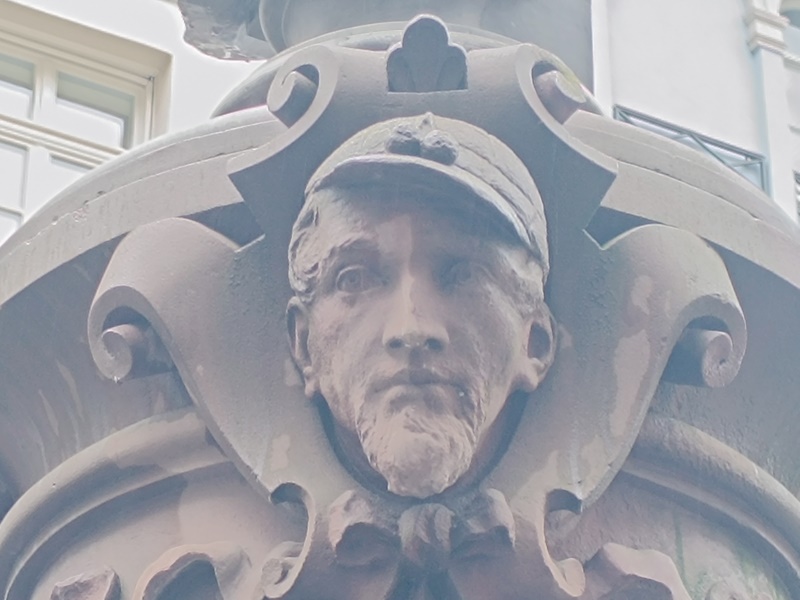 Das Kapitell der Säule zeigt Figuren aus Stoltzes Werken, darunter
