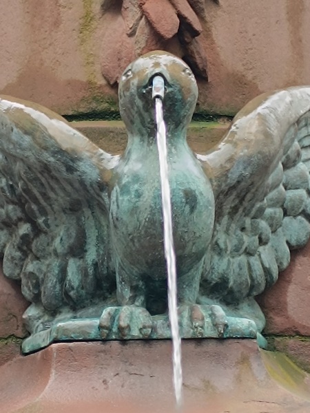 aus Granit erhebt sich ein dreiseitiges Wasserbecken mit einem Brunnenstock