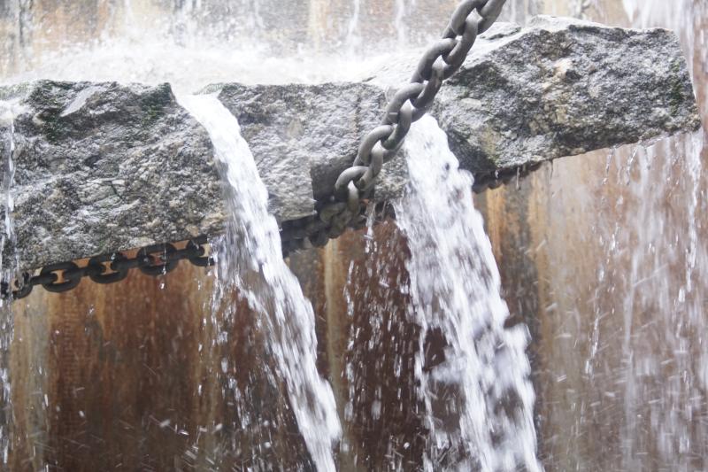 sind mit dicken Ketten im Brunnen aufgehängt und am Treppenaufgang