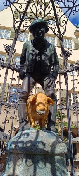 war. Bauernbursche und Schwein stehen auf einem glockenförmigen Postament,