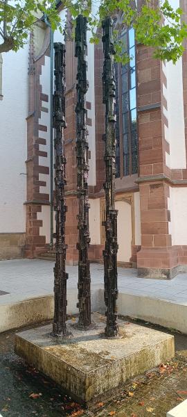 als Wasserspiel mit drei schlanken, gegliederten Bronzesäulen entworfen,