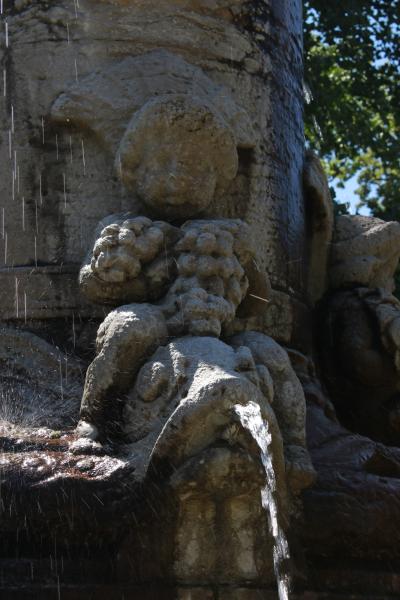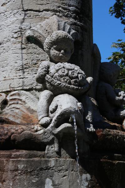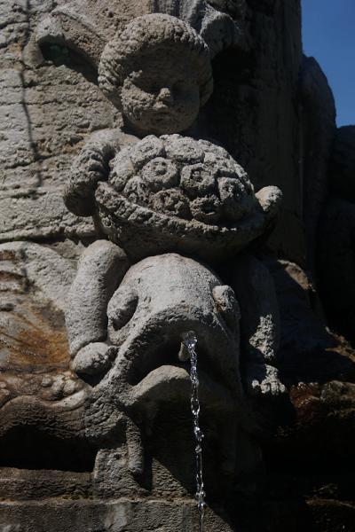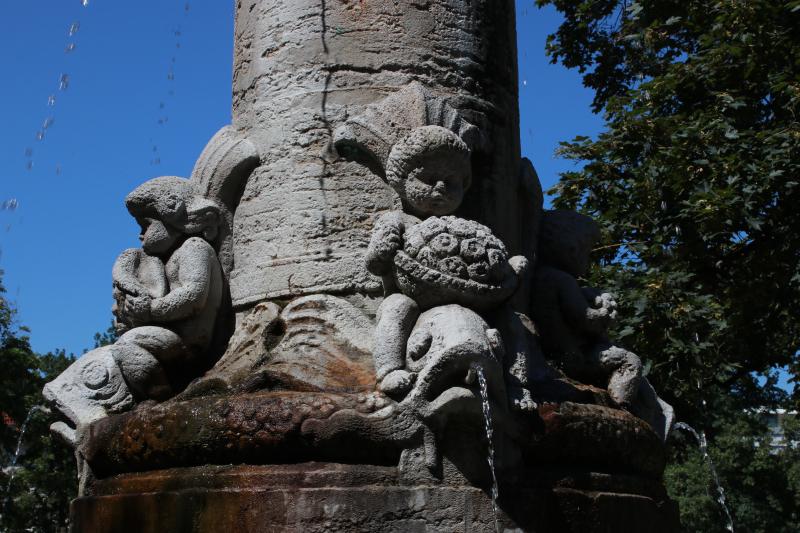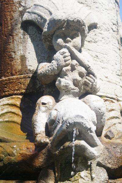 Vier auf Delphinen reitende Putten krönen den Sockel. Sie sind Symbole