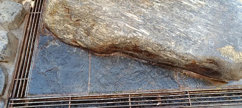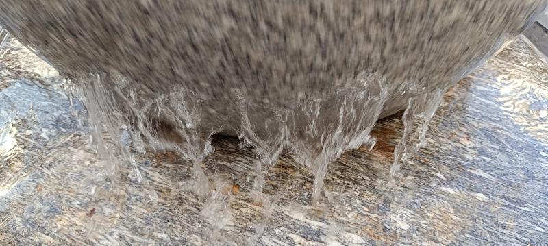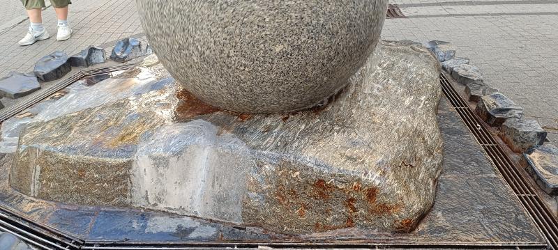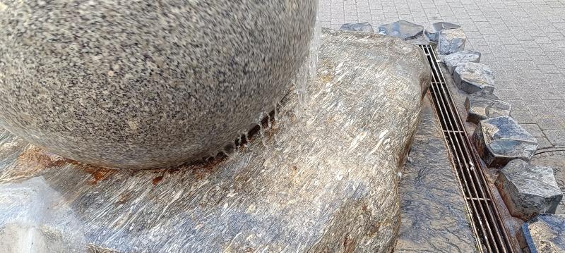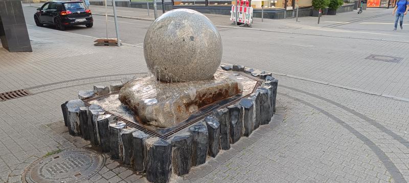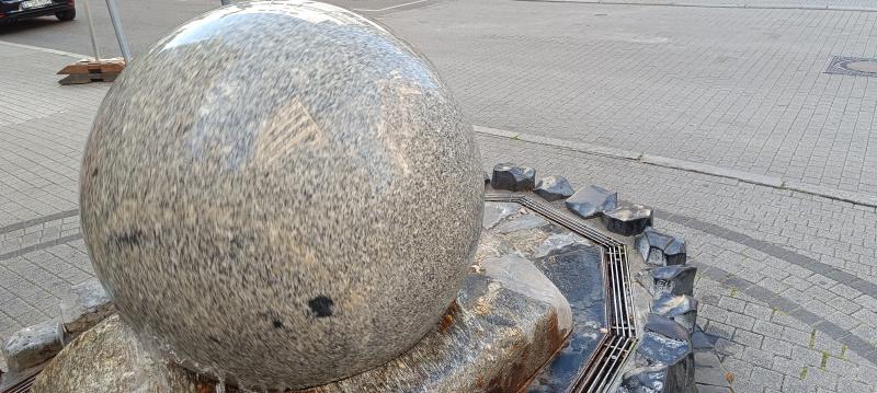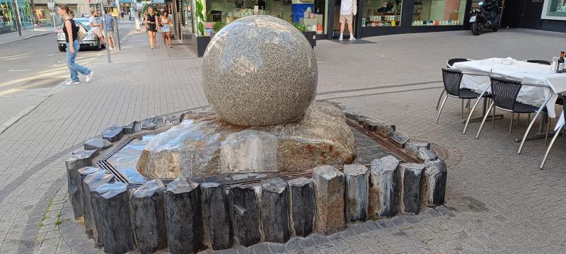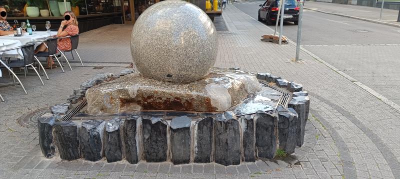 versetzt worden. Vor dem "Kugelbrunnen" ist ein Kanaldeckel in das Pflaster eingelassen. Auf diesem ist zum einen der Hinweis auf die Stifter des Brunnens zu finden: "Dieser Brunnen wurde gestiftet von der Anliegergemeinschaft Calwer Strasse". Zum anderen enthält der Text Informationen zum Brunnen selbst: "Striegauer Granitkugel Ø 1000 mm, fein poliert und gewuchtet, Gewicht ca. 1,5 t, schwimmend auf Granitbasis Findling Gewicht ca. 2,0 t.". Umrahmt wird der "Kugelbrunnen" von einem Kranz aus Basaltgestein. |