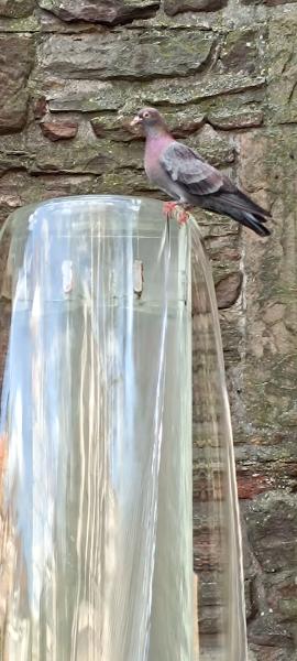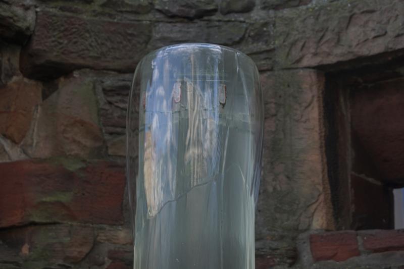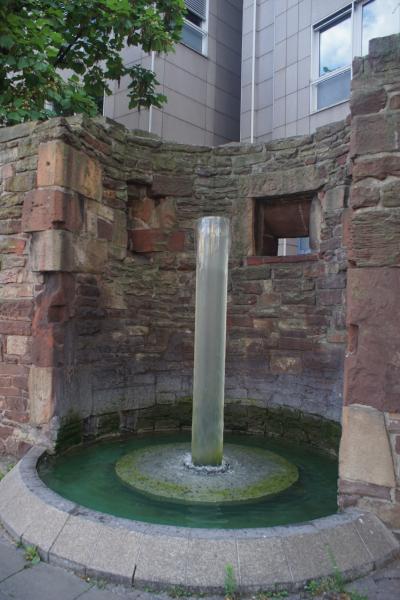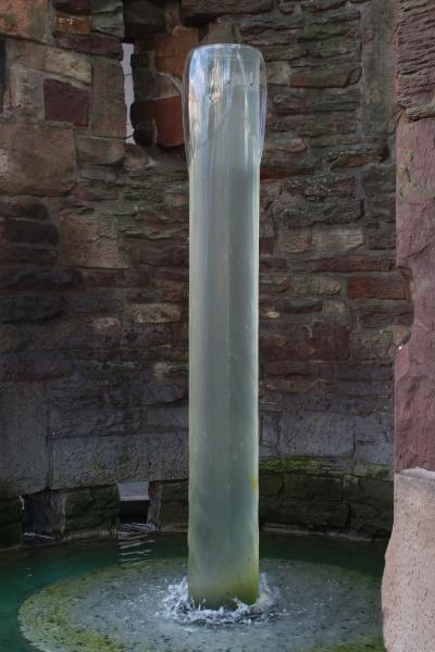 In seine Wölbung ist ein Wasserspiel mit einer hohen Kunstglassäule
