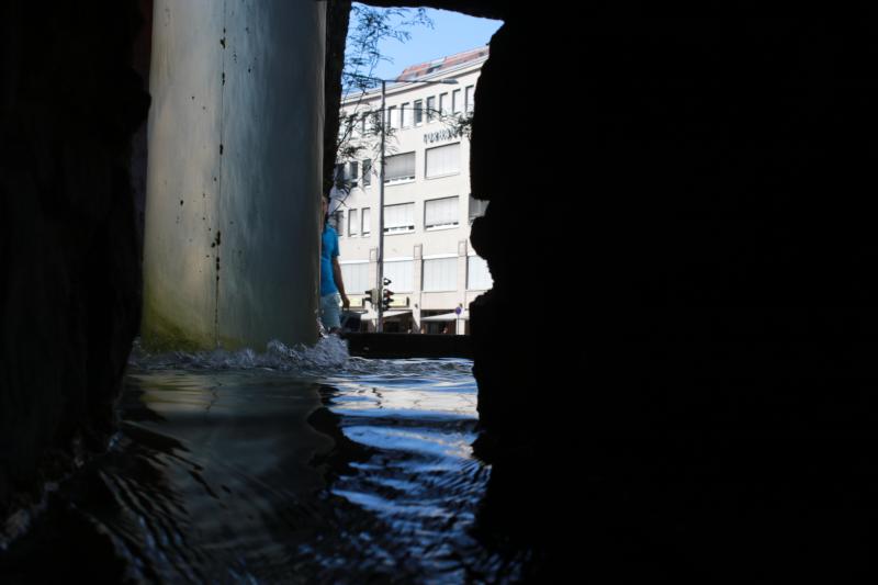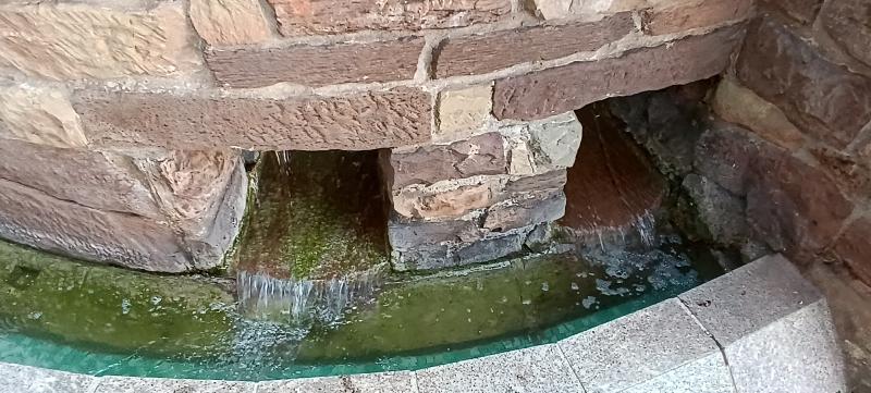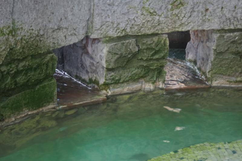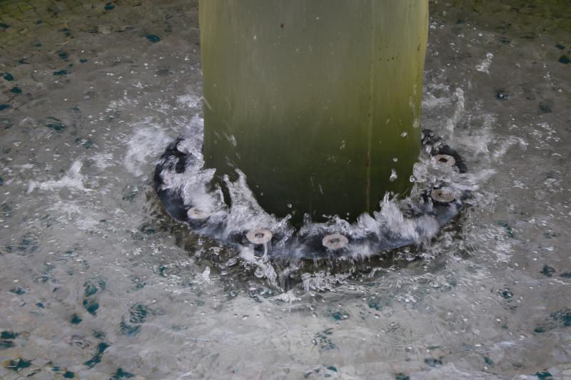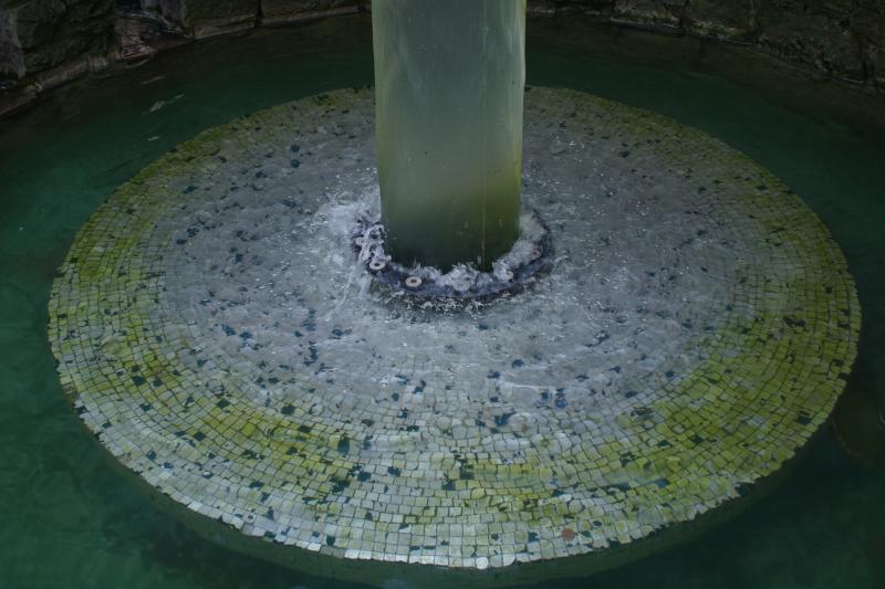 eingebaut, in der das Wasser aufsteigt und in ein rundes Becken mit einem