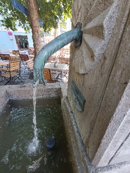 Die Reliefs an der Straßenseite zeigen zwei Enten. Auch der Ausguss