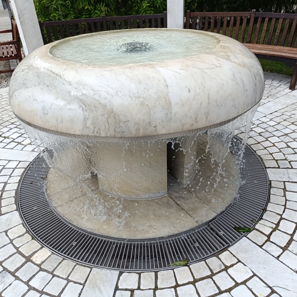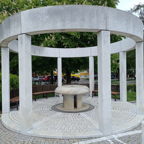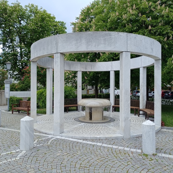 Er besteht aus Marmor und steht in der Mitte einer Pergola aus Stein.