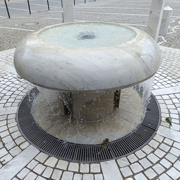Ein rundes Becken steht auf einem etwas schmaleren Fuß. Sanft läuft
