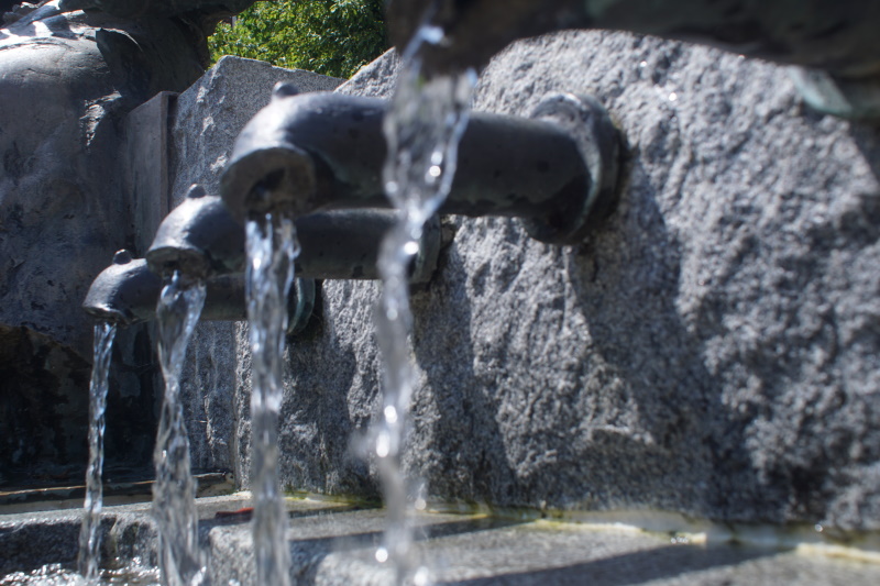 Wohnsiedlung. Das Wasser, das aus vier seitlichen Auslässen in das