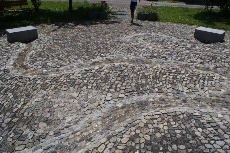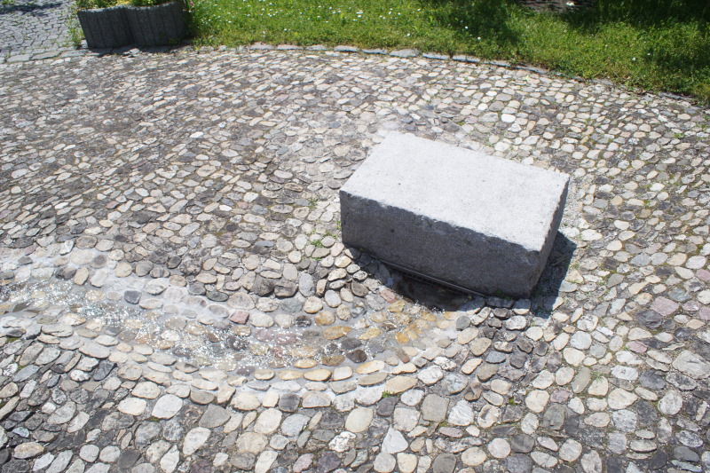 kleinen Steinen gepflasterten Boden eingelassene Rinnen zu den Sammelbecken,
